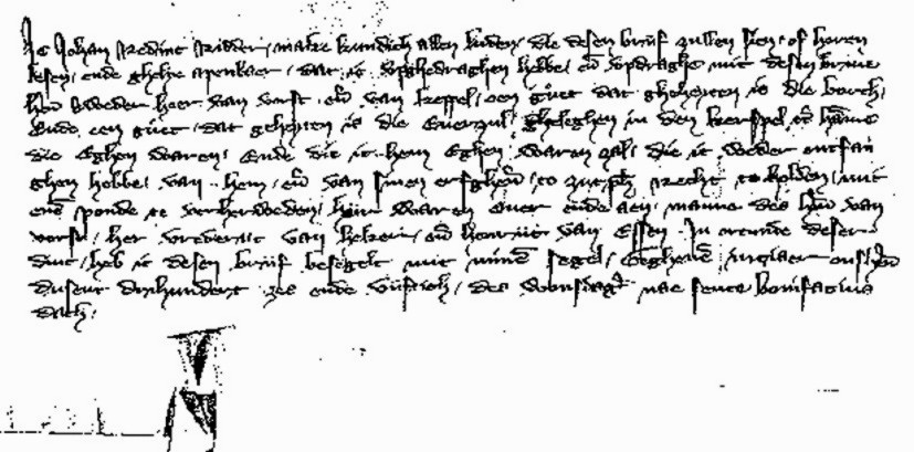 Ic Johan Redinc Ridder, make kundich allen luden, Die desen breijf zullen sien, of horen lesen, ende ghelyc apenbaer, dat ic opghedraghen hebbe, ende opdraghe mit desen breijv heren Sweder heer van vorst ende van keppel, een guet dat gheheyten is die borch, ende een guet dat geheyten is die Everzul, gheleghen in den kerspel den hame die Eghen waren, Ende die ic hem Eghen waren zal, die ic weder ontfanghen hebbe, van hem, ende van sinen erfghenamen, to zutfen recht to holden, mit ene ponde te verherweden, hiijr waren over ende aen, manne die heren van vorst, her vrederijc van heker, ende henrijc van Essen. In orcunde deser dinc, heb ic desen breijf besegelt mit minen segel, Gegheven intjaer ons heren dusent drehundert zes ende vijftich, des wonsdages nae sente bonifacius dach.